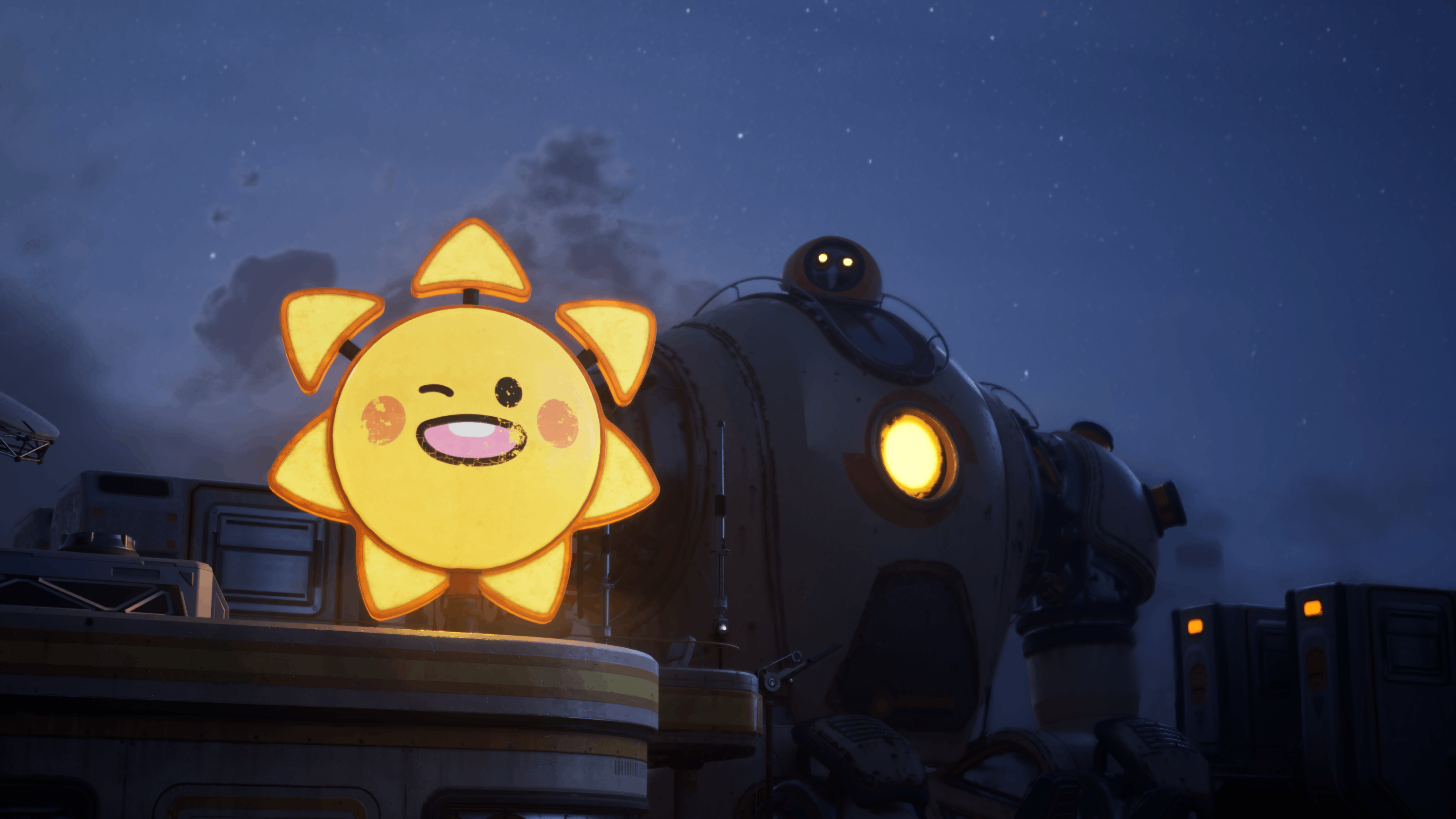 When the sun sets and the robot stops to charge, you'll make camp, craft new gear, and repair your mechanical guardian. But the wasteland is freezing cold at night. Stay close to the robot to keep warm.